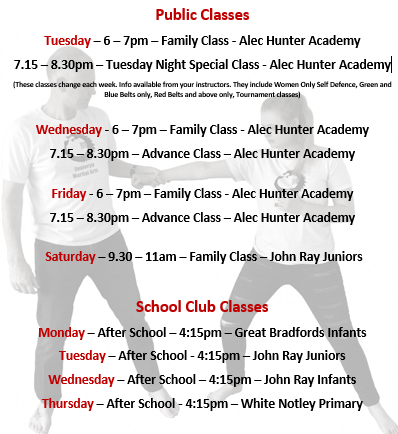 These classes change each week. Info available from the Instructors. These classes include Women Only Self Defence classes, Green and Blue Belts only classes, Red Belts and Above only classes and Tournament classes.